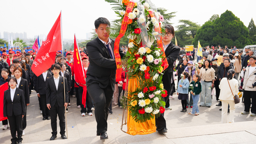 苍松翠柏掩映下的纪念塔庄严肃穆。9时许,祭扫仪式正式开始。全体人员整齐列队,面向烈士纪念塔垂首肃立,集体默哀三分钟,向为民族独立、国家解放而牺牲的革命先烈们表达深切的哀悼与追思。学生代表步履坚定地抬着花篮拾级而上,向烈士敬献花篮。随后,全体人员绕塔一周,瞻仰纪念塔上的浮雕,重温那段波澜壮阔的革命历史。