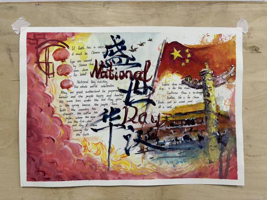 此次活动创新采用“英语+美术”跨学科形式,在提升学生英语综合应用能力与艺术审美素养的同时,为大家搭建了展示才华、交流互鉴的平台,同学们在创作实践中深化了对民族文化的认同,将爱国情、强国志融入青春成长,让爱国主义教育在校园落地生根。